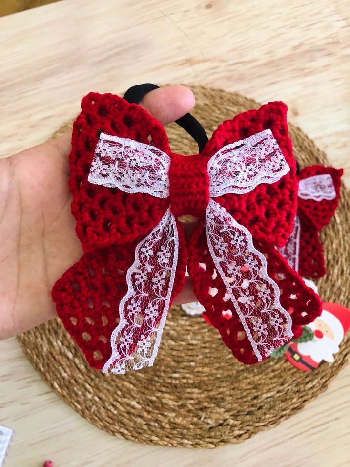 Kırmızı örgüden yapılmış, beyaz dantel detaylı fiyonk saç aksesuarı. Rahat ve bohem tarzı, renkli ve retro-hippi havası taşıyor.