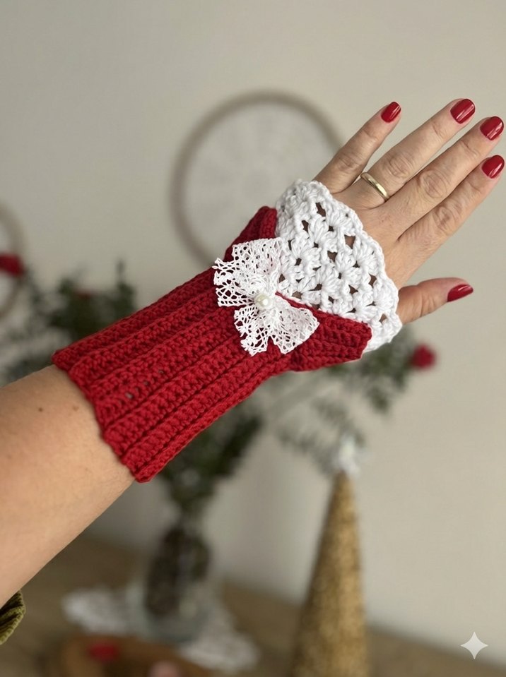 Kırmızı örgü kadın eldiveni, beyaz dantel süslemeli ve zarif fiyonk detaylıdır. Bohem tarzda, nostaljik bir görünüme sahiptir.