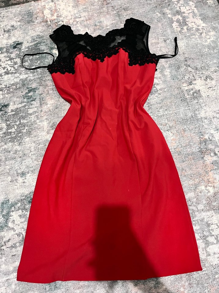 Bu kırmızı, vücuda oturan midi elbise, straplez yakaya ve siyah dantel detaylara sahiptir. Cesur gotik tarz için uygundur, kolsuz ve desensizdir. Göğüs pedleri vardır