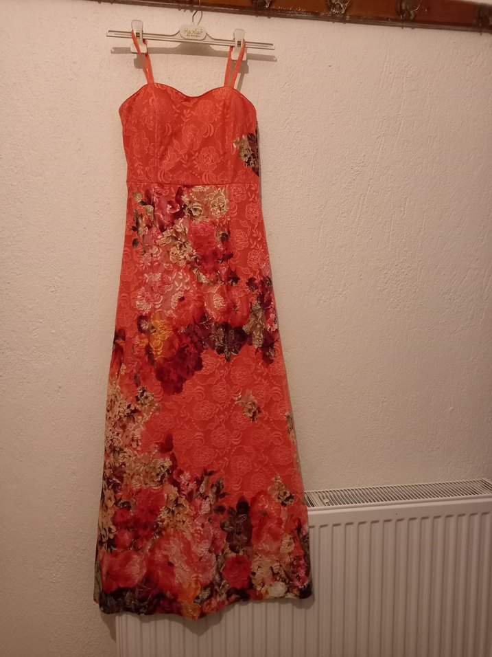 Dantel detaylı, straplez askılar çıkabilir ve vücuda oturan bu uzun elbise, renkli tie-dye çiçek desenleriyle bohem tarzını yansıtıyor. marka temsilidir
