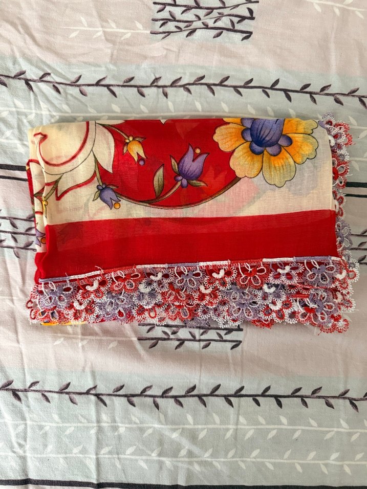 Çiçek desenli, dantel işçiliğiyle süslenmiş renkli kırmızı kadın fuları. Yumuşak tekstil kumaştan, vintage bohem tarzında.