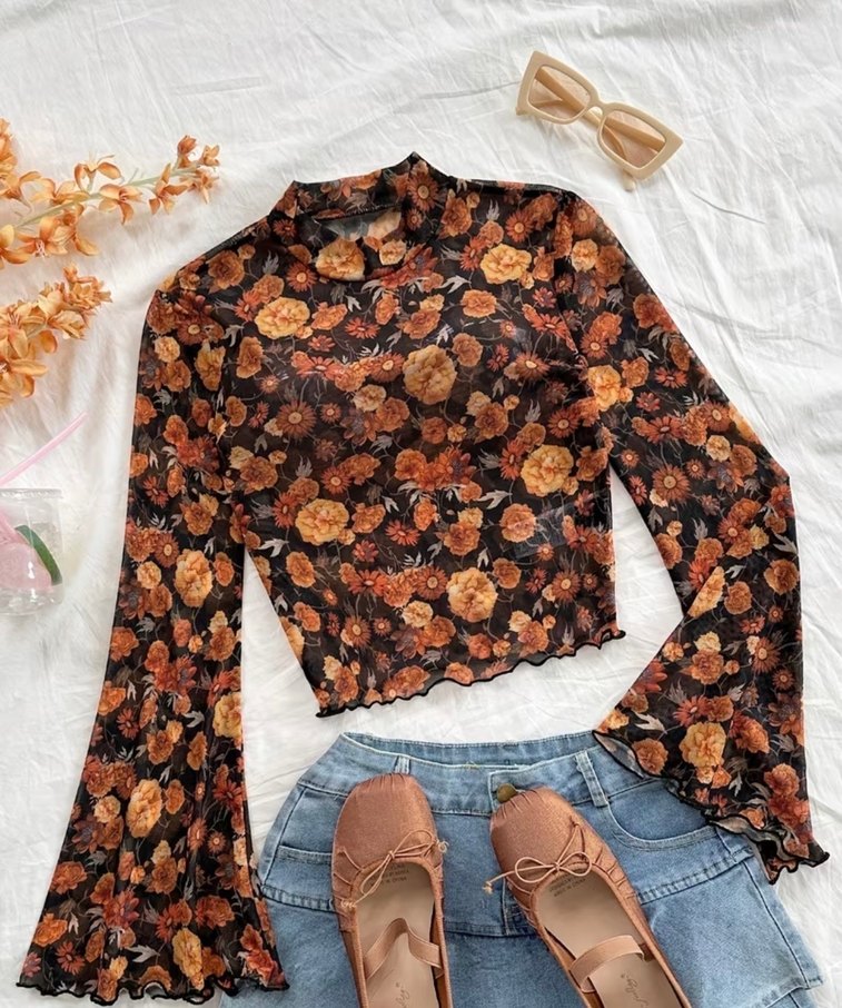 Dar kesim, uzun kollu ve balıkçı yaka bluz. Koyu kahverengi tie-dye çiçek desenli, dantel detaylı kısa bluz. Sentetik kumaştan, günlük sokak stiline uygun. Kullanılmadı