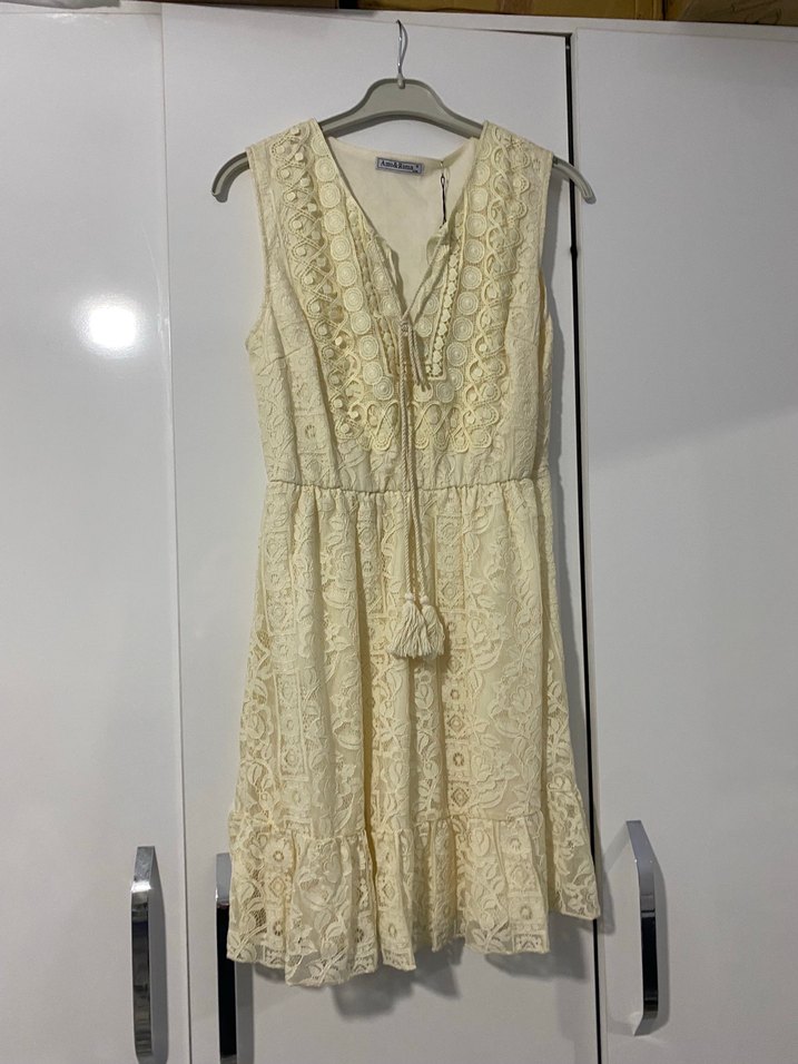 Kolsuz, V yaka, bej renkli kısa boy, dantel işlemeli triko elbise. Bol kesim ve bohem tarzıyla günlük kullanım için uygundur.