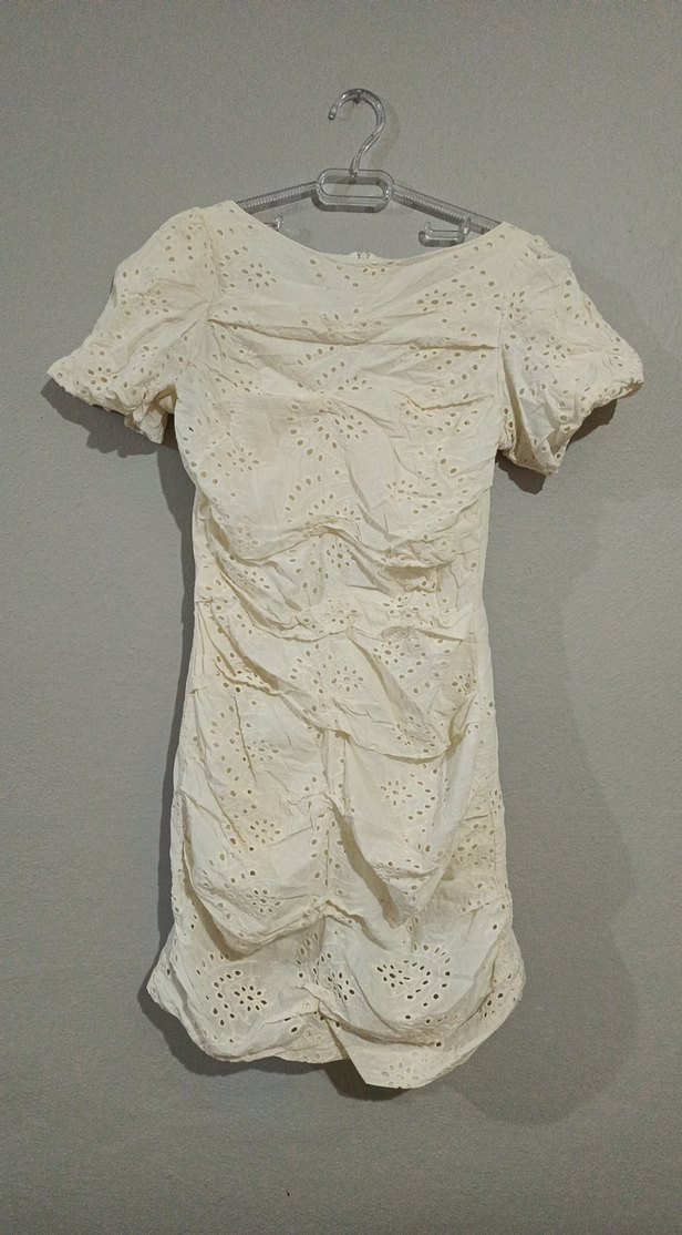 Beyaz keten kumaştan, dantel işlemeli, kısa kollu, bohem tarzda, minimal desenli dar kesim mini elbise. Drape detayları mevcuttur. Ürün boyu 85 cm.