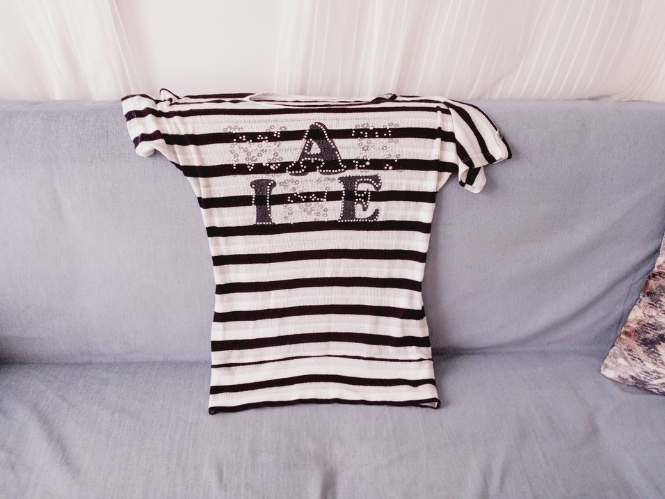 Gri ve beyaz çizgili, dantel detaylı, kısa kollu, tekne yaka, normal boyda dar kesim hamile tişörtü.