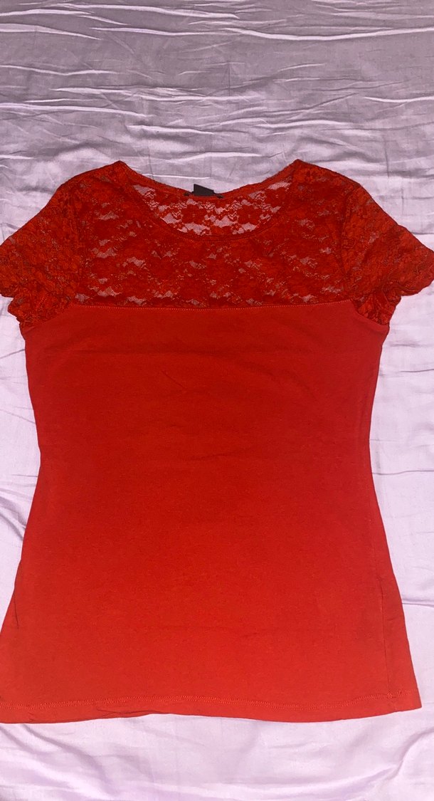 Yuvarlak yaka, kısa kollu ve dantel detaylı kırmızı, vücuda oturan bluz. Düz ve şık tasarımı romantik akşamlar için uygun.
