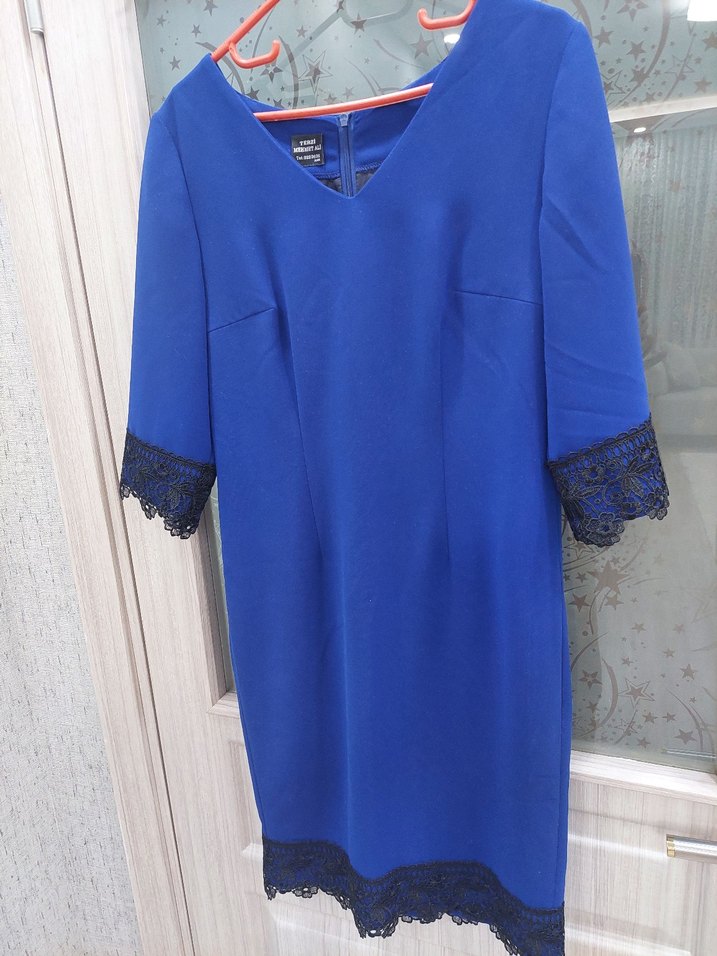 V yaka ve kısa kollu, dantel detaylı, fitted kesim midi elbise. Koyu mavi renk, ofis için uygundur.