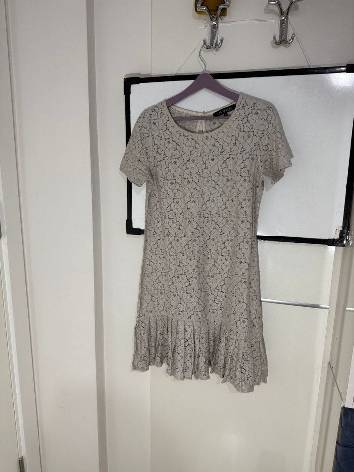 Bej renkli bu midi elbise, kısa kollu ve dantel detaylıdır. Rahat kesimi ve yumuşak keten kumaşıyla günlük kullanıma uygundur. Bohem tarzda, konforludur.