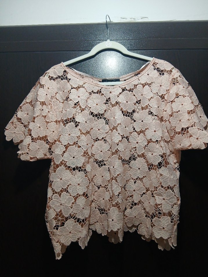 Dantel Detaylı Kısa Kollu pudra pembe Bluz