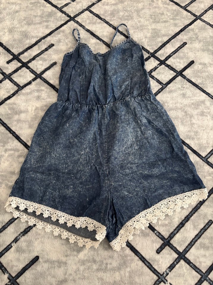 Askılı, straplez yaka ve bol kesim kısa kot tulum. Dantel detayları ve lacivert-gri batik deseniyle bohem tarzı tamamlar.