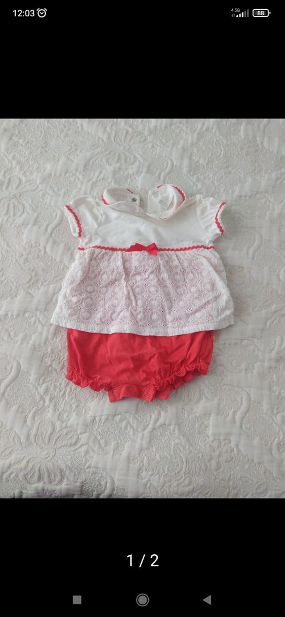 Dantelli ve nakışlı beyaz kolsuz üst ile canlı kırmızı şortlardan oluşan kız bebek takımı.