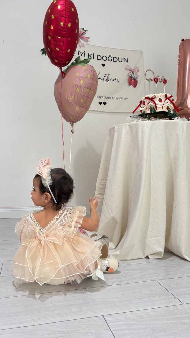 Dantel detaylı, straplez yakalı ve kısa kollu, klasik şıklıkta pastel pembe bohem tarzda kız çocuk elbisesi. Kızım 11 ay 10 kg iken giydi ona göre alırsınız