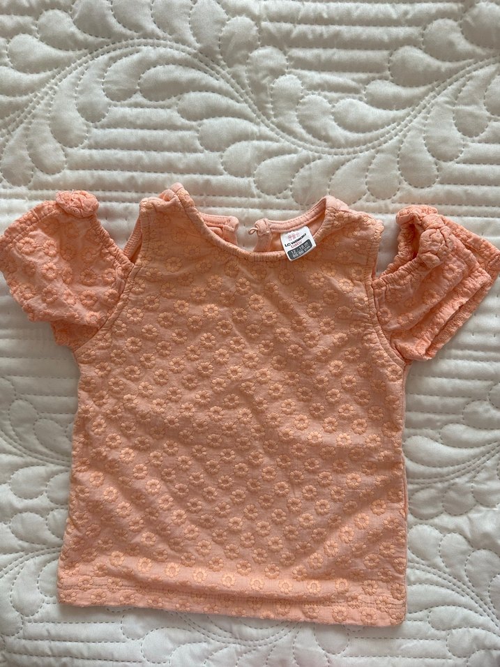 Pembe renkli, dantel detaylı ve işlemeli desenli, kısa kollu, yuvarlak yakalı, vücuda oturan kız çocuk bluzu.