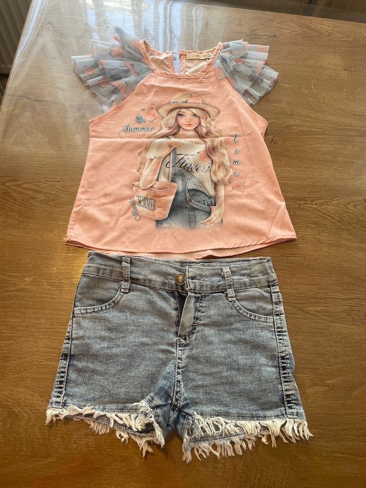 Dantel detaylı, pastel pembe kısa kollu üst ve yırtık detaylı açık renk kot şorttan oluşan 4 yaş kız çocuk takım.