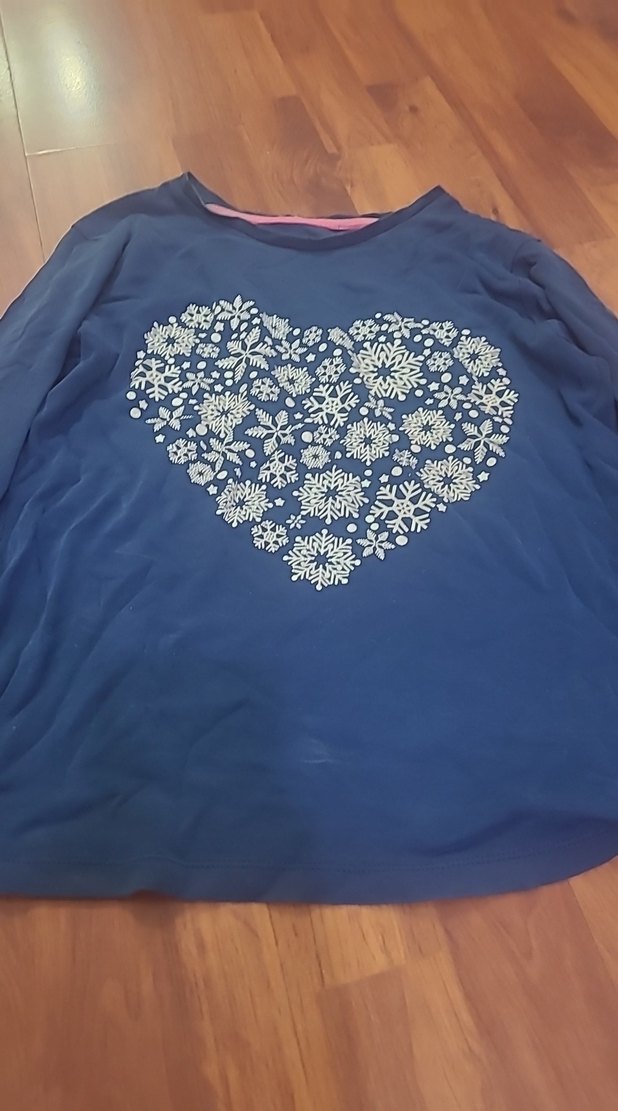 Koyu mavi renkte, dantel detaylı ve çiçek desenli kalp baskılı kız çocuk uzun kollu tişört. Rahat kesim ve yuvarlak yaka bulunur.