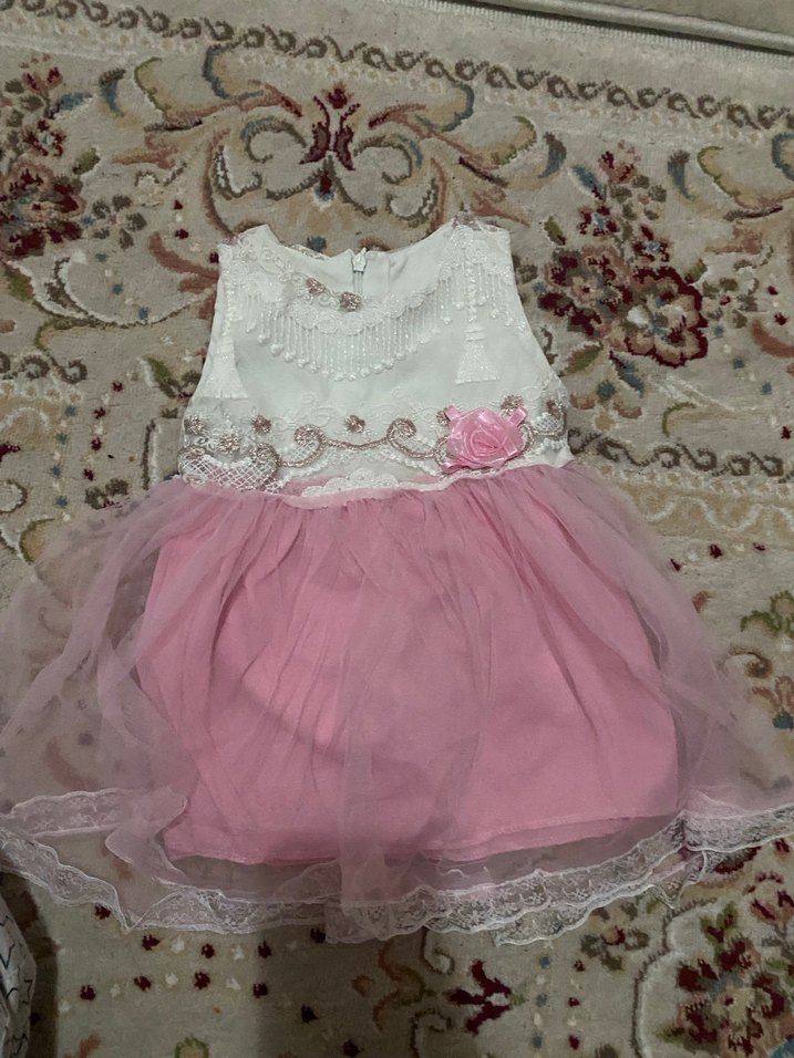 Dantel ve nakış detaylı, askısız kız çocuk elbisesi. Fitted üst kısmı ve pastel pembe, katmanlı yumuşak etek kısmı bulunur.