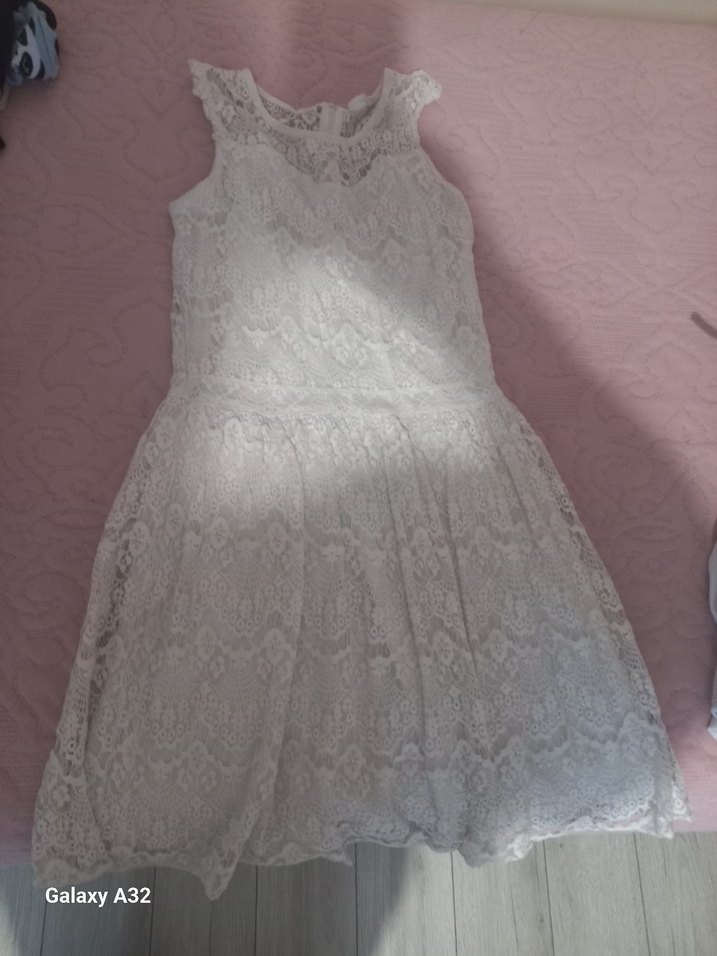 Dantel detaylı, kolsuz beyaz elbise, V yaka ve ince kesimiyle klasik ve bohem tarzı bir araya getirir.