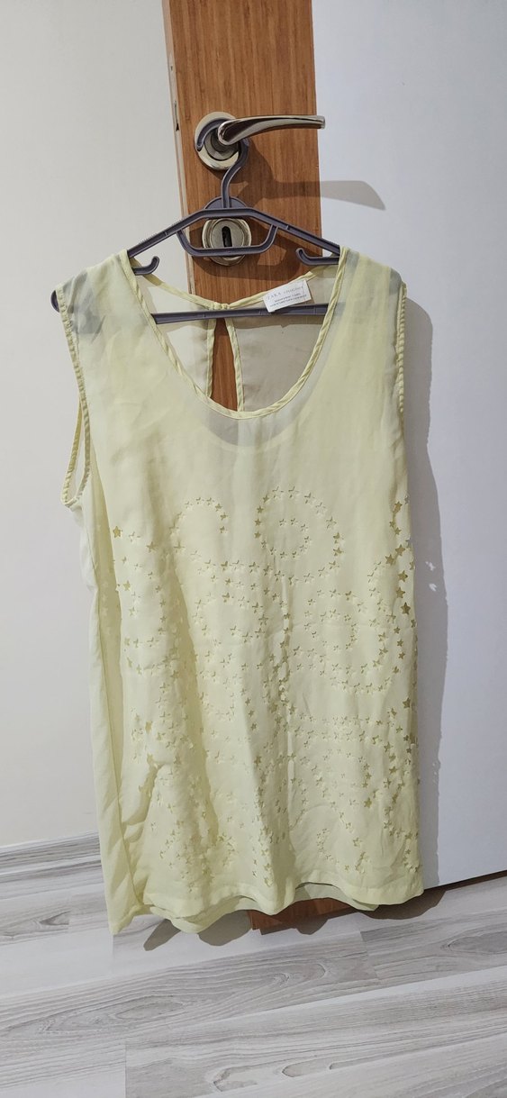 Dantel detaylı, kolsuz sarı, rahat kesim. Yuvarlak yaka ve midi boy, bohem tarz için ideal.