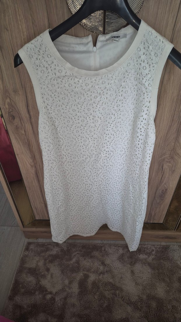 Kolsuz, dantel detaylı ve yuvarlak yakalı mini bluz. Yumuşak sentetik kumaştan, rahat kesim ve minimalist tarzda, günlük sokak modasına uygun.