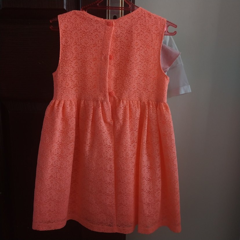 Kolsuz, dantel detaylı nar çiçeği kız elbisesi. Rahat kesimli ve askısız yakaya sahip, sentetik kumaştan üretilmiştir.