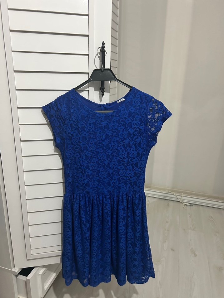 Koyu mavi renkte, dantel detaylı, midi boy, fitted kesim elbisedir. Kolsuz ve yuvarlak yaka tasarımı romantik akşamlar için uygundur.
