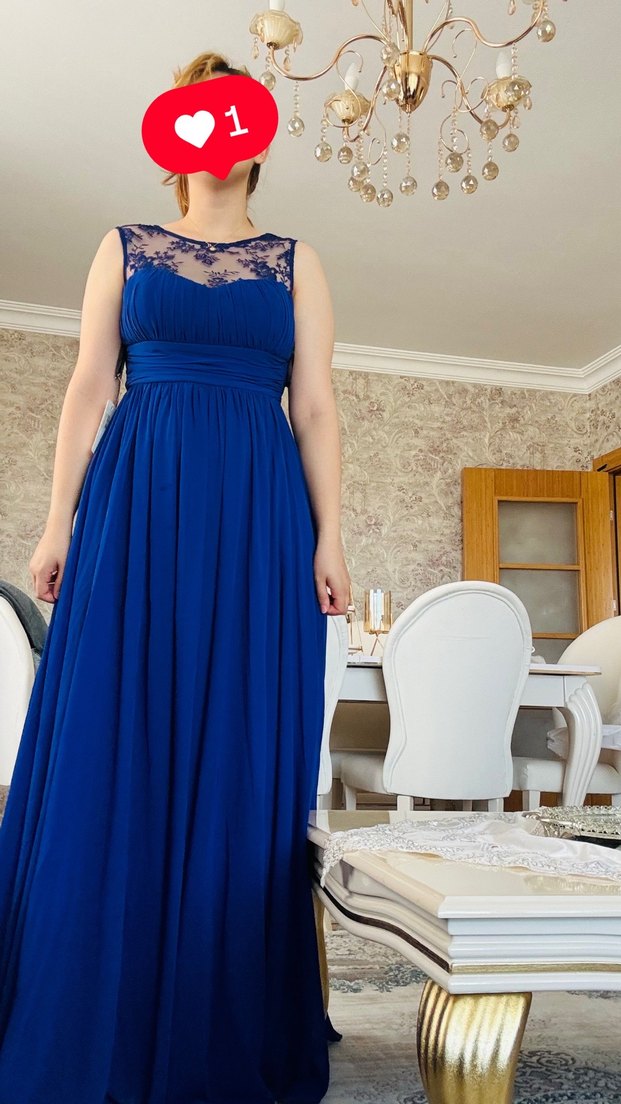 Dantel Detaylı Koyu Mavi Uzun Abiye Elbise