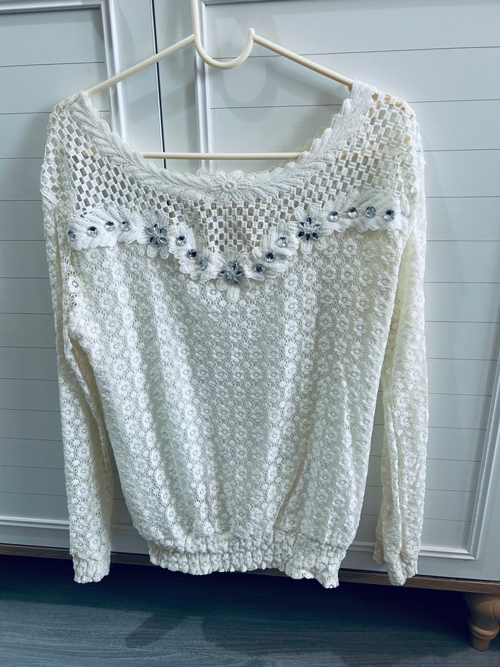 Dantel detaylı, bisiklet yaka ve uzun kollu krem örgü model bluz. Bol kesim ve bohem tarzda, günlük kullanıma uygundur.