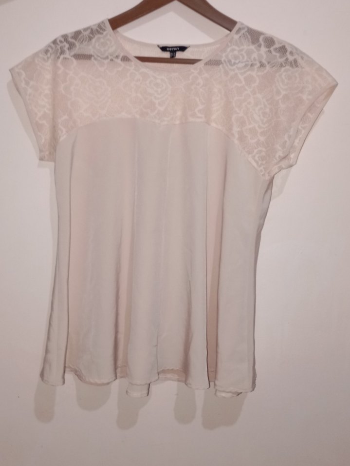 Krem renkli, kısa kollu, üst kısmı dantel detaylı bluz. Yuvarlak yaka ve bol kesim, yumuşak sentetik kumaştan üretilmiştir. Günlük sokak stiline uygundur.