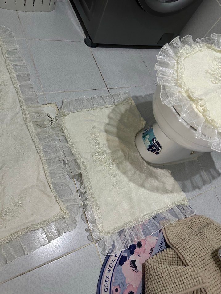 Krem renkli, dantel detaylı klozet kapağı ve paspaslardan oluşan banyo takımı, mekâna zarif bir dokunuş katıyor.hiç bir sıkıntısı yok kullanışlı temiz