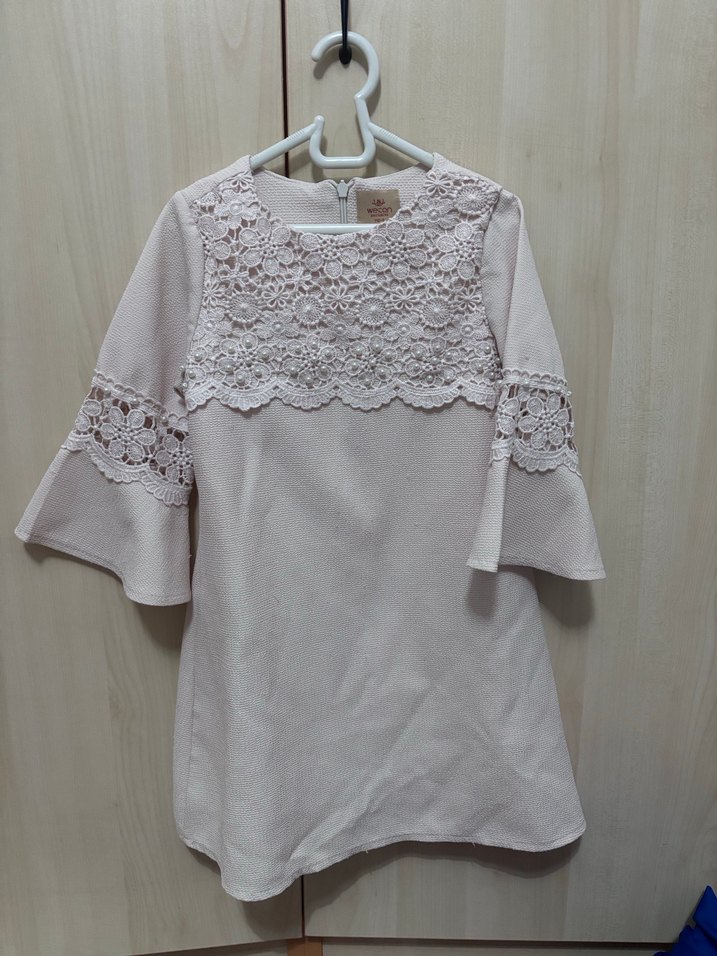 Dantel detaylı, triko kumaştan yapılmış, krem rengi, bol kesim, yuvarlak yakalı, kısa ve geniş kollu kadın bluz. Günlük kullanıma uygundur.
