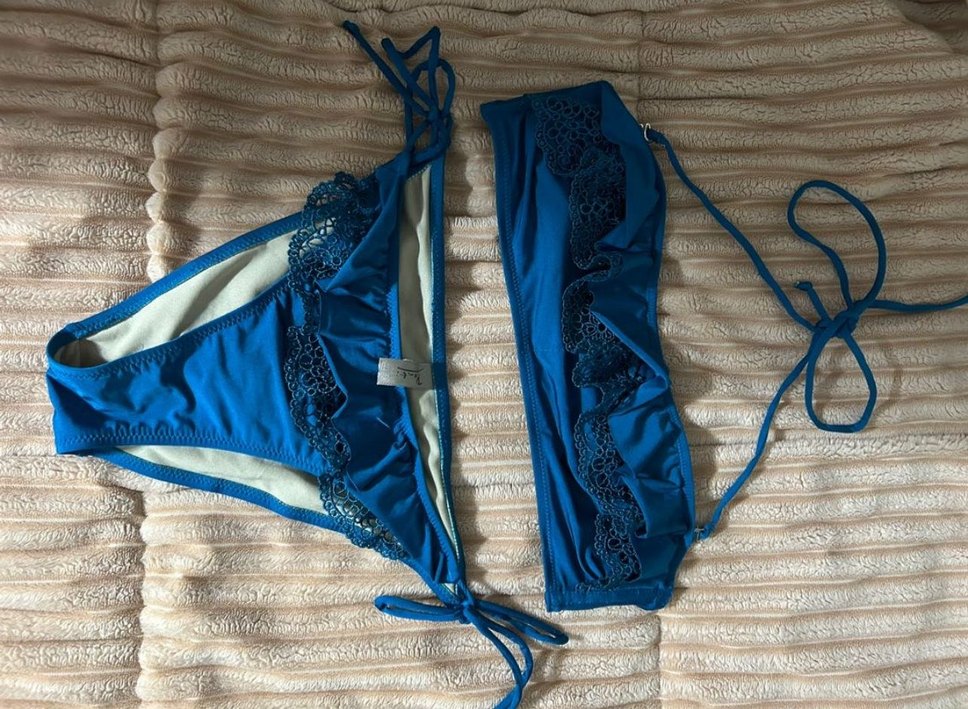 Dantel işlemeli lacivert, strappy askılı, bohem tarzda, plaj için uygun, vücuda oturan bikini.