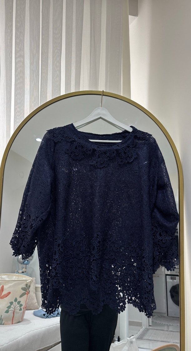 Lacivert renkte, uzun kollu ve tekne yaka, dantel işlemeli örme kumaştan, bol kesim bohem tarzda günlük kullanıma uygun kadın bluz.
