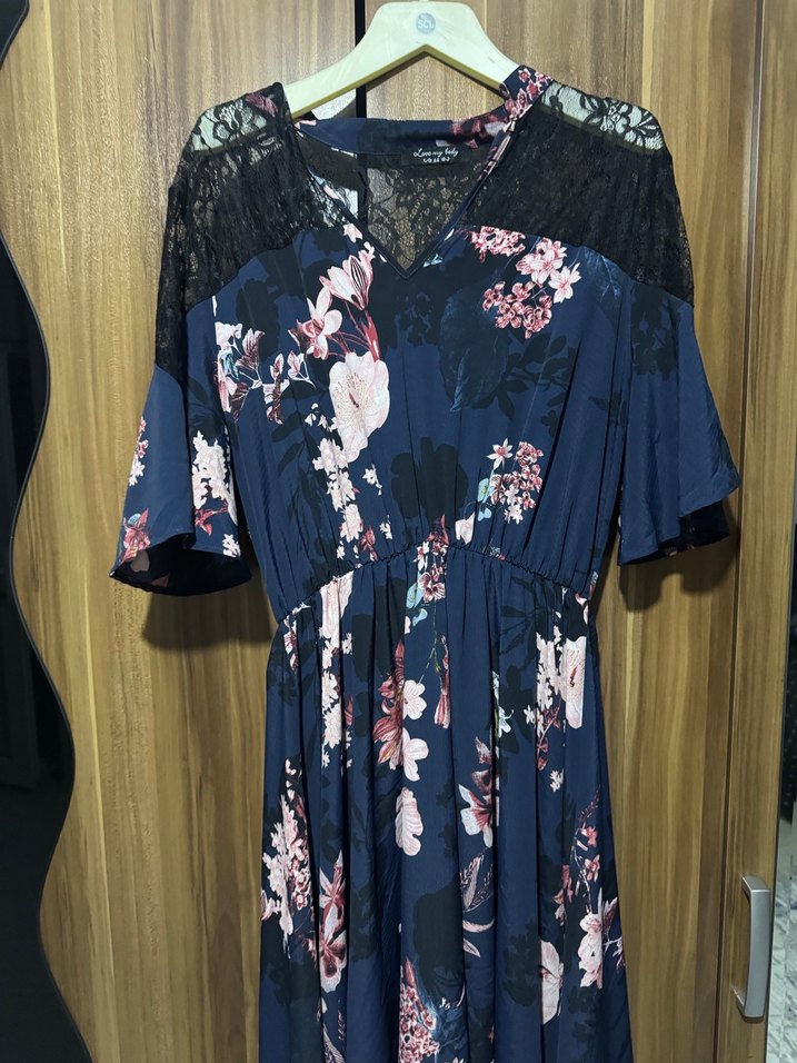 Lacivert uzun elbise, V yaka, kısa kollu ve omuzlarda dantel detaylıdır. Çiçekli desenli, bol kesimdir ve romantik buluşmalar için uygundur.