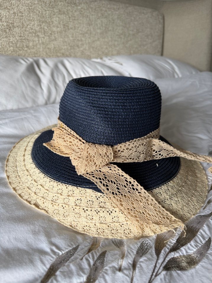koyu lacivert örme şapka, bej dantel kurdele detaylı Hiçbir deformasyon yoktur Ölçüler fotoğrafta mevcut