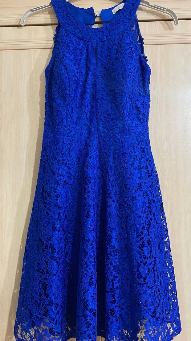 Kolsuz, V yaka, dantel kumaştan yapılmış lacivert midi elbise. Fitted kesimi ve bohem Paris tarzıyla düğünler için uygun. 2 kere kullanıldı
