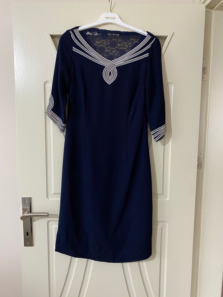 Lacivert midi elbise, dantel detaylı, V yakalı ve kısa kollu. Romantik akşamlar için uygun, klasik ve modern bir şıklık sunar.