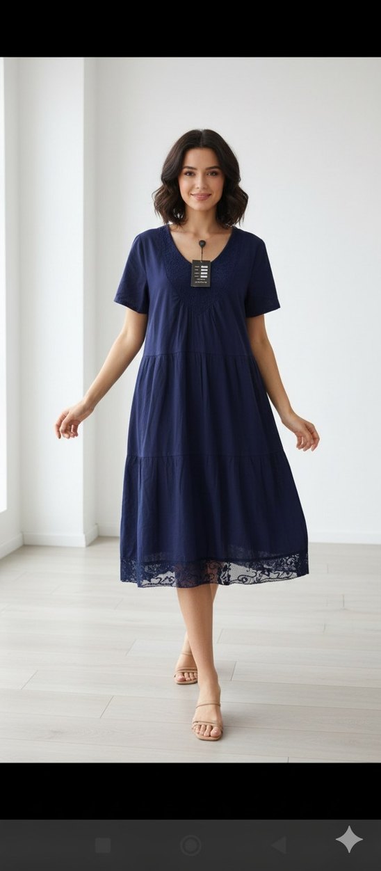Lacivert midi elbise, kısa kollu ve V yaka, bol kesimdir. Yumuşak kumaştan yapılmış, dantel detaylarıyla bohem tarzı yansıtır, romantik akşamlar için uygundur.