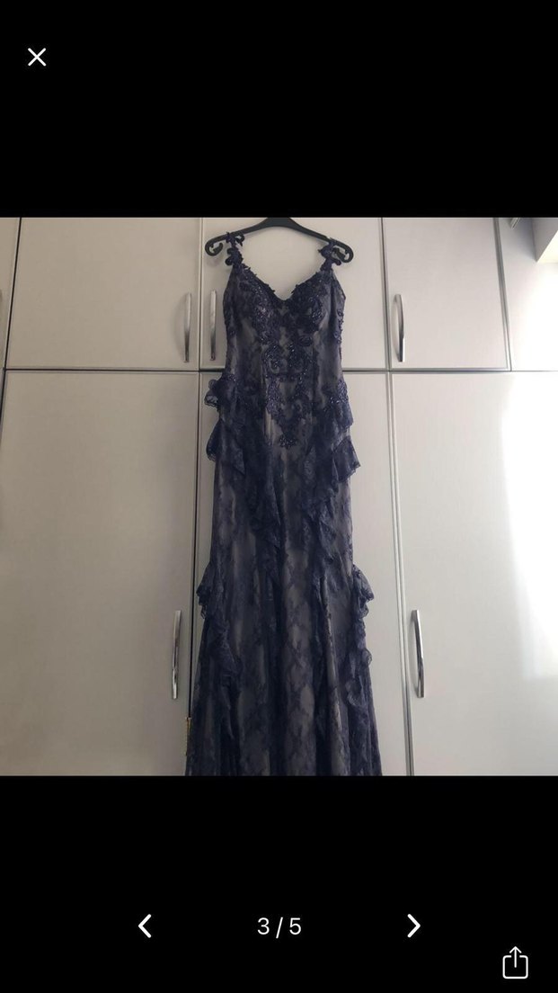 Lacivert renkli, v yaka ve ince askılı, dantel detaylı, uzun ve vücuda oturan abiye elbise… arkası ipli ayarlanabilir