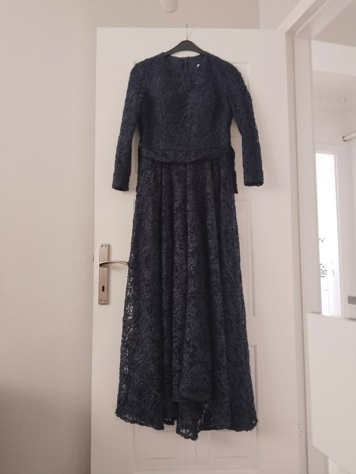 Lacivert uzun dantel detaylı abiye elbise, uzun kollu ve bol kesimdir. V yaka ve desensiz tasarımıyla düğünler için uygundur, gotik klasik şıklık sunar.