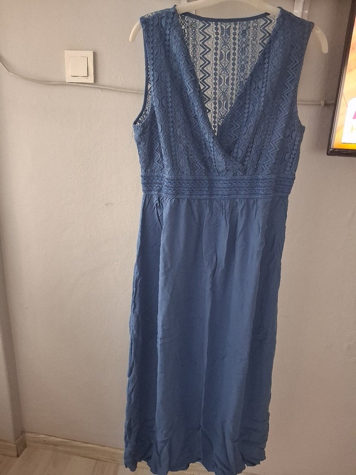 Dantel detaylı, V yaka, kolsuz lacivert uzun keten elbise. Yumuşak kumaştan, bol kesim bohem tarzı için uygundur.
