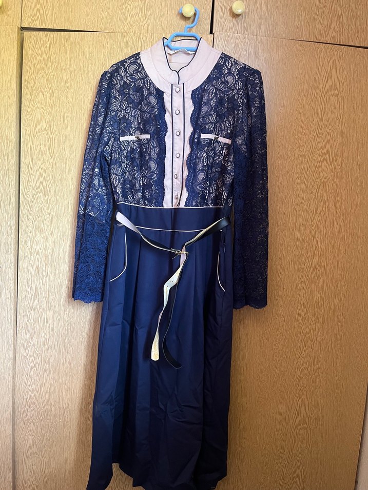 Dantel detaylı ve nakışlı desenlere sahip uzun lacivert elbise, yakasında kesik yakalıdır. Uzun kollu ve rahat kesimdir. Sentetik kumaştan yapılmıştır, günlük kullanım için klasik şıklık sunar.