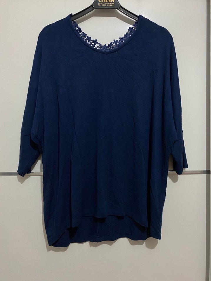 Lacivert renkte, V yaka ve uzun kollu kadın bluz. Dantel detaylı, yumuşak keten kumaştan, rahat kesimli ve normal boyda, günlük kullanım için uygundur.