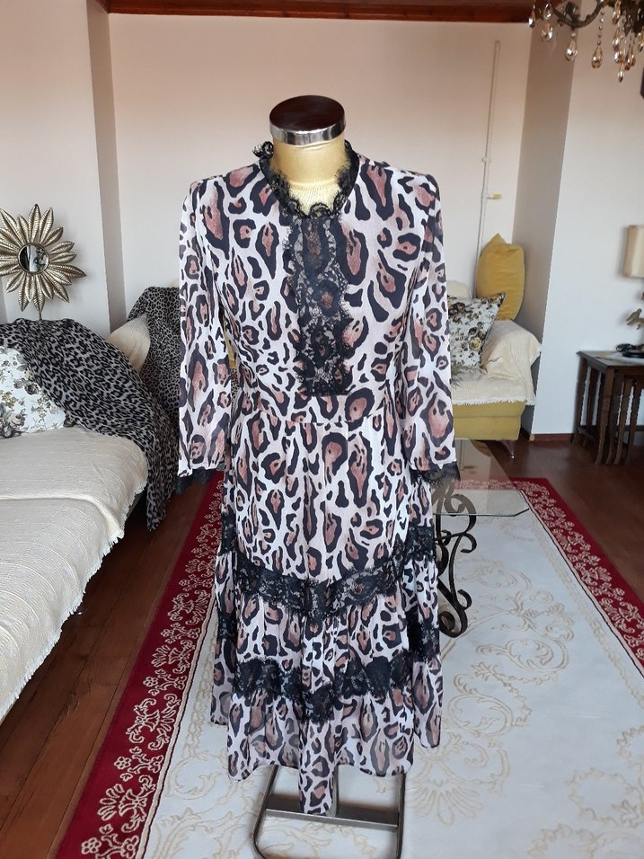 Dantel detaylı, leopar desenli uzun elbise. Bol kesim, uzun kollu ve yakalı, yumuşak şifon kumaştan yapılmıştır.