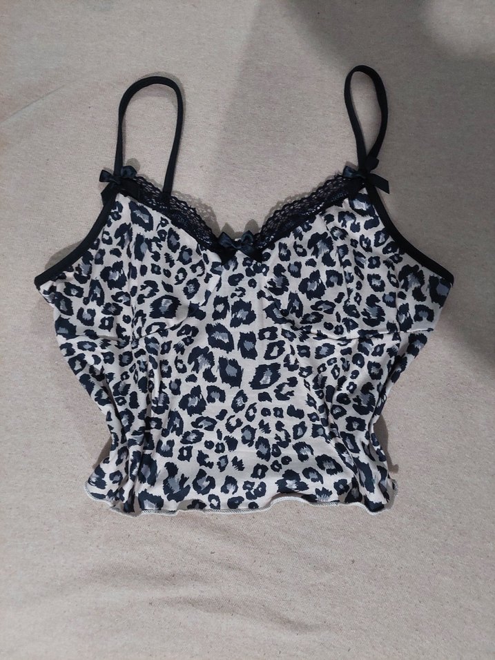 Dantel detaylı, V yaka ve ince askılı, leopar desenli. Sentetik kumaştan, cesur sokak stili için uygun.