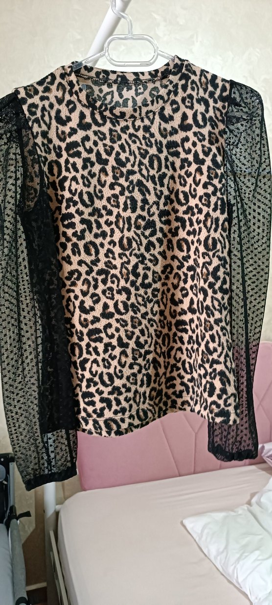 Dantel detaylı uzun kollu, boğazlı, leopar desenli kahverengi kadın bluz, rahat sentetik kumaştan, günlük kullanıma uygun.