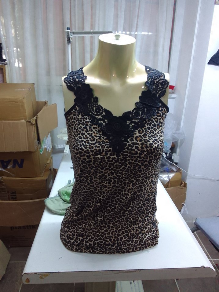 Dantel detaylı V yaka, koyu kahverengi leopar desenli, dar kesim kadın atlet. Günlük kullanıma uygun, cesur ve gotik tarzda.