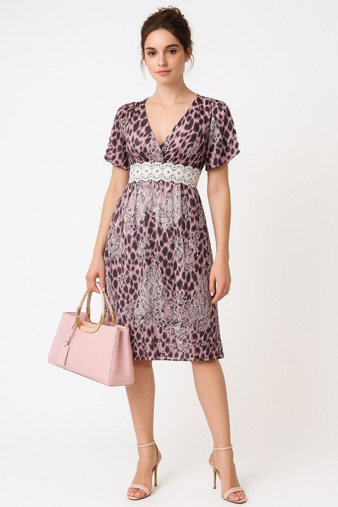 DANTEL DETAYLI LEOPAR ŞİFON ELBİSE pembe