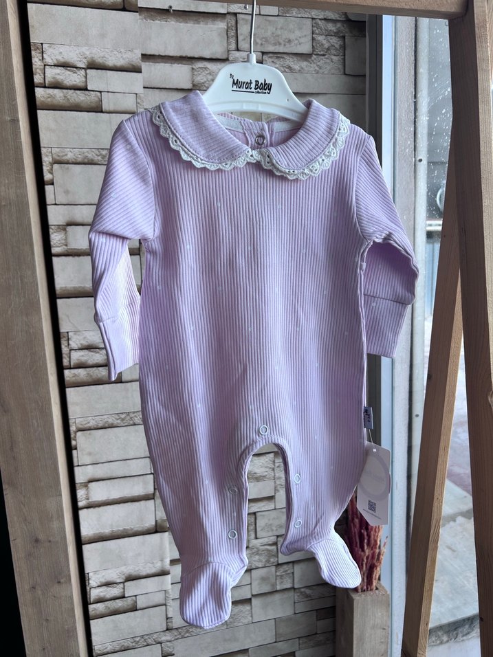 Pastel lila renkli, nakışlı dantel yakalı ve yumuşak fitilli kumaştan yapılmış bebek tulumu. Kolay giydirme için çıtçıtlı uzun kollu. %100 pamuk üründür. 0-3, 3-6 ay için 2 beden seçenekleri mevcuttur.