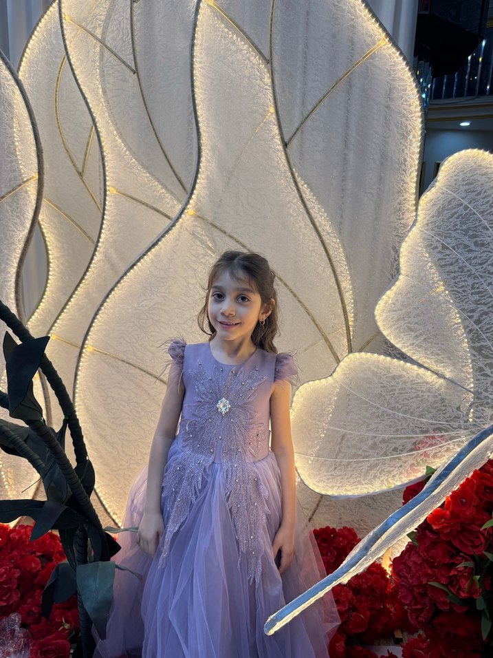 Açık mor renkli, dantel ve işlemeli detaylara sahip, v yaka ve kolsuz, vücuda oturan bohem tarzda kız çocuk elbisesi.