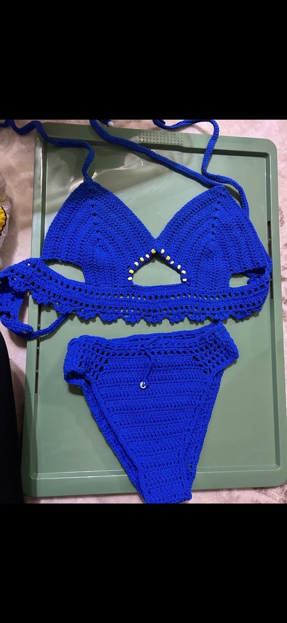 Mavi renkte, dantel detaylı ve askılı bohem tarzı bikini. Mini boy ve sade deseniyle cesur bir görünüm sunar. Ürün tamamen en örgüsüdür kendimizi yapıp evde satıyoruz